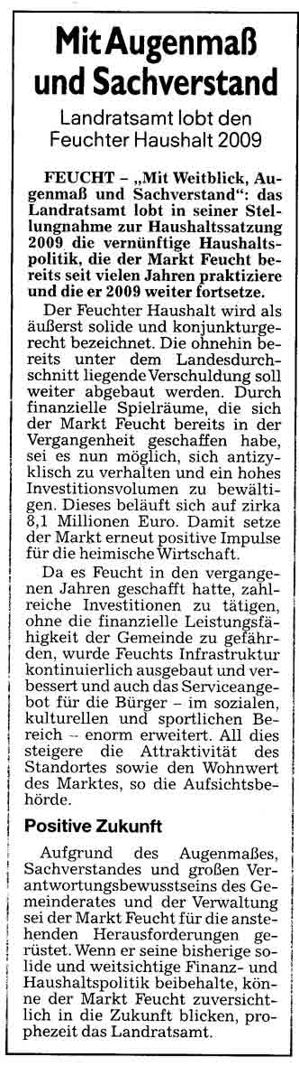 Als objektive Genehmigungsbehörde prüft das Landratsamt jedes Jahr den Feuchter Haushalt - und seit vielen Jahren erhält Bürgermeister Konrad Rupprecht dabei jeweils hohes Lob. Auch heuer ist dies erneut der Fall - wie nebenstehender Artikel vom 2.6.09 aus dem Boten eindrucksvoll belegt. Der Haushalt für das Jahr 2009 und auch die Finanzplanung für die kommenden Jahre stehen auf gesunden und festen Füßen - und das ist das Ergebnis der langjährigen soliden und vorausschauenden Haushaltspolitik von Bürgermeister Konrad Rupprecht und der Feuchter CSU. Die CSU-Fraktion wird aber auch weiterhin darauf achten, dass Investitionen nur in einem für den Markt Feucht vertretbarem Rahmen getätigt werden und dabei haben in der Vergangenheit und werden auch zukünftig notwendige sozialen Anliegen die erforderliche Berücksichtigung erfahren. Es ist erfreulich, dass diese Haltung der CSU – die Gewährung von sozialen und freiwilligen Leistungen durch den Markt Feucht unter Wahrung einer soliden finanziellen Basis - im Marktgemeinderat in der Vergangenheit die notwendigen Mehrheiten erhielt. Wir sind es mittlerweile auch gewohnt, dass die Feuchter SPD außer einigen Mäkeleien kaum Konkretes entgegenzusetzen hat. So bemängelte beispielsweise der stellvertretende SPD-Fraktionsvorsitzende Schwächen bei Investitionen und für soziale Maßnahmen im Etat 2008: "Hier hätten wir uns mehr Mut und Weitblick bei einer Reihe von Positionen gewünscht". Als übergeordnete Behörde ist da das Landratsamt im Gegensatz zur Feuchter SPD zu höchster Objektivität verpflichtet - und spricht Klartext: "Aufgrund des Augenmaßes, Sachverstandes und großen Verantwortungsbewusstsein des Gemeinderates und der Verwaltung ist der Markt Feucht für die anstehenden Herausforderungen gerüstet. ..... Durch zahlreiche Investitionen in den vergangenen Jahren wurde die Infrastruktur kontinuierlich ausgebaut und verbessert und das Serviceangebot für die Bürger im sozialen, kulturellen und sportlichen Bereich enorm erweitert." H.Bauer |